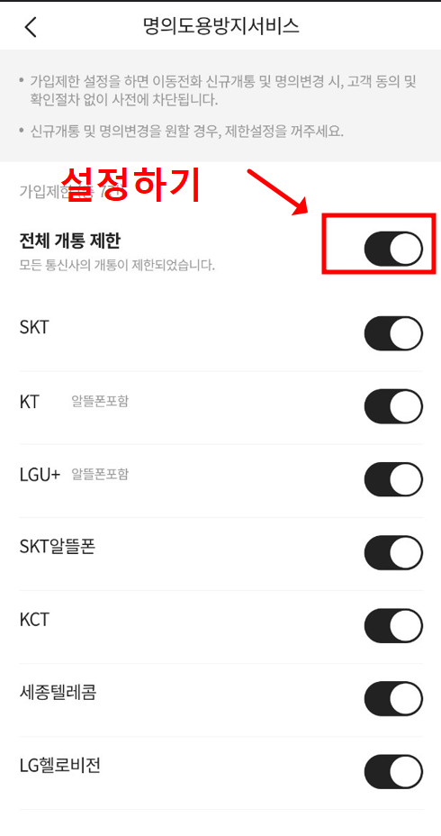 - PC: 엠세이퍼 홈페이지 접속 → 공동/금융 인증서 로그인 → '가입제한 서비스' 클릭 → 전체 개통 제한 설정