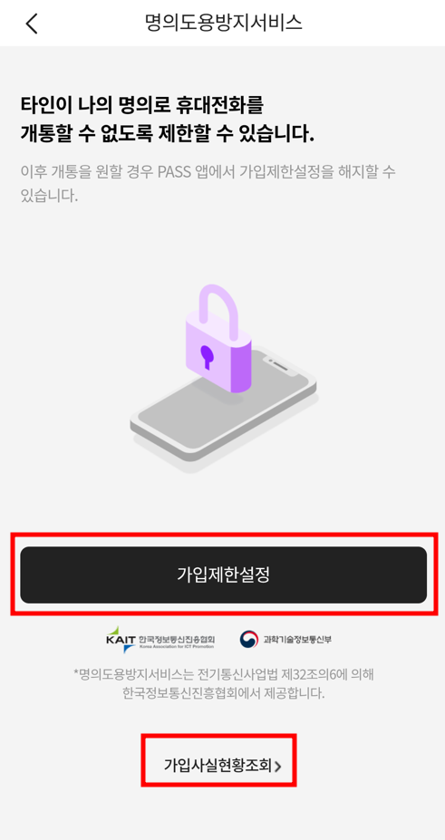 - 주요 기능: 내 명의로 된 통신서비스 개통 현황 조회, 신규 개통 차단, 알림 서비스