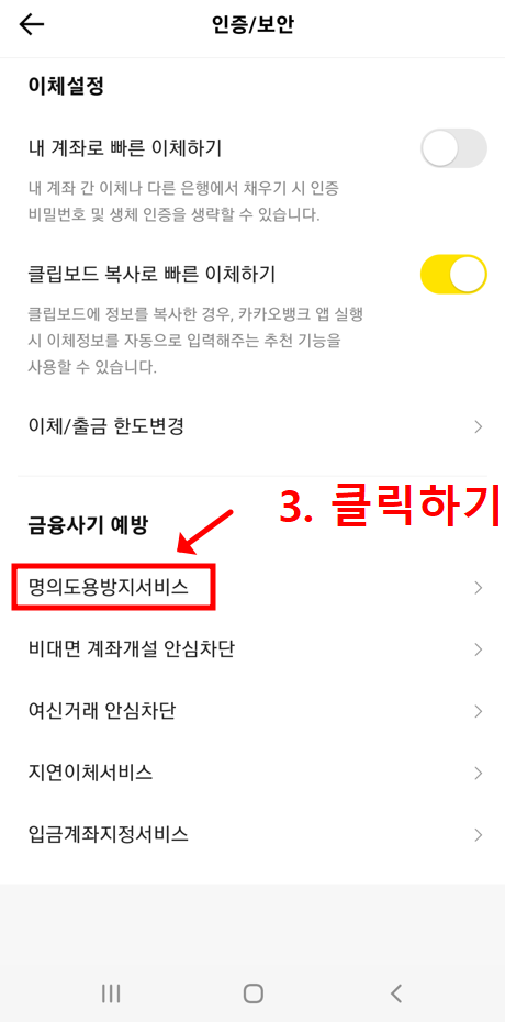 - 카카오뱅크 앱: 앱 실행 → [전체] → [인증/보안] → '명의도용방지서비스' → 본인인증 후 신청