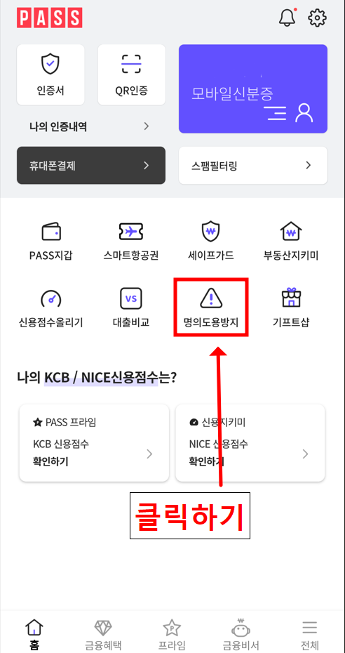 - PASS 앱: 앱 실행 → [전체] → '명의도용방지서비스' 클릭 → 약관 동의 및 본인인증 → 설정 저장