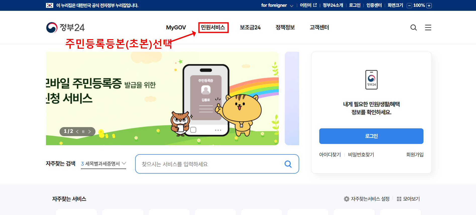 - 주요 민원(등본, 전입신고, 보조금 등) 바로 이용 가능
